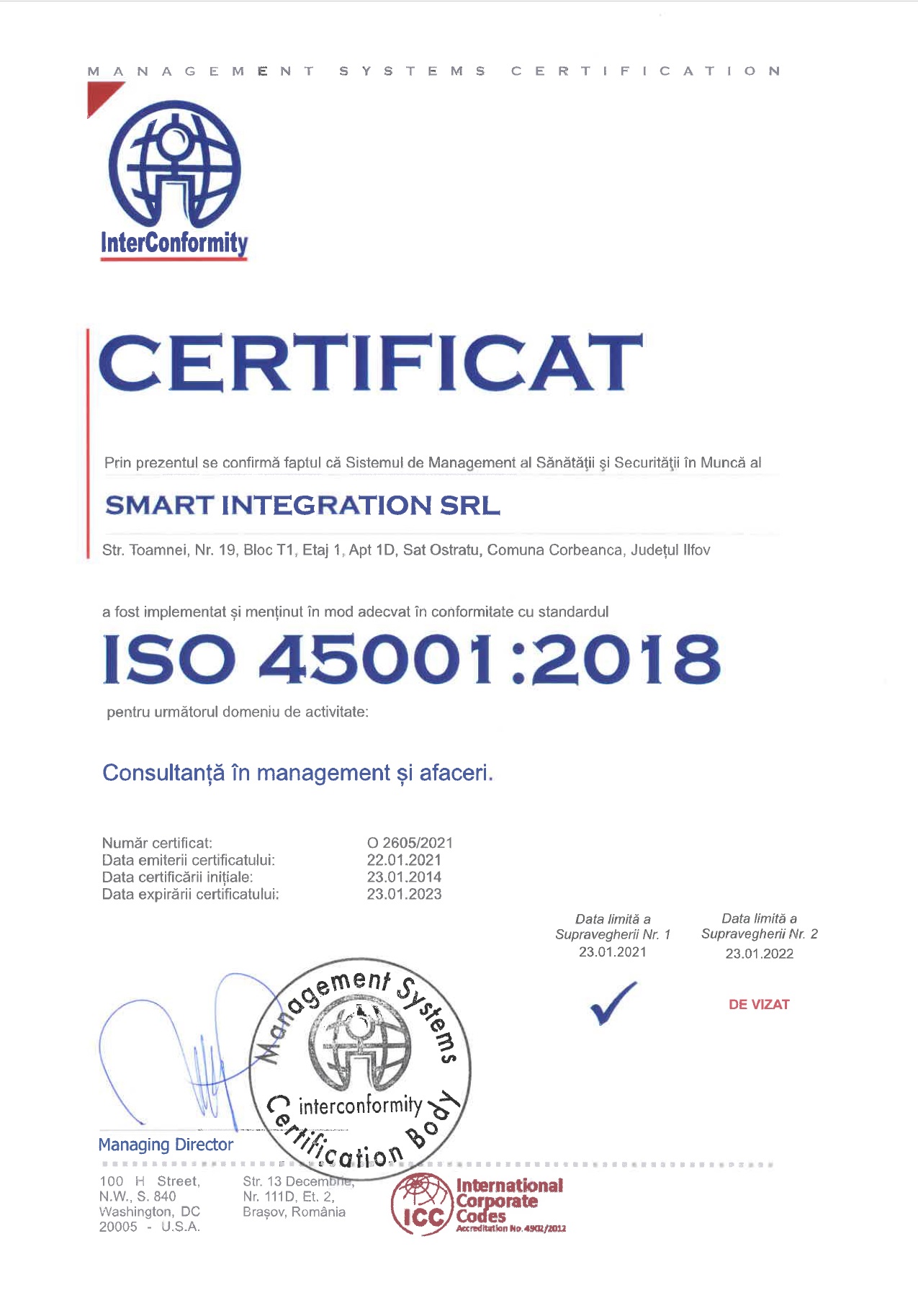Urmare a unui proces de audit si certificare inceput in august 2013, SMART Integration a obtinut din ianuarie 2014 certificarile pentru implementarea Sistemului de Management al Calitatii, Sistemului de Management al Mediului si Sistemului de Management al Sanatatii si Securitatii Ocupationale, in conformitate cu cerintele standardelor ISO 9001:2008, ISO 14001:2004 si OHSAS 18001:2007.